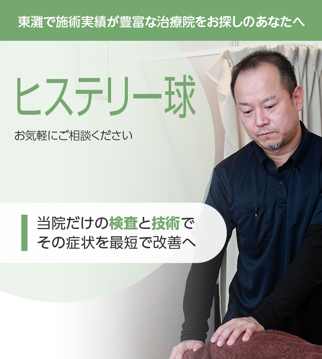 病院やほかの治療院で改善しなかったとしても諦める必要はありません。ヒステリー球は豊富な施術実績を誇る当院にお任せください。