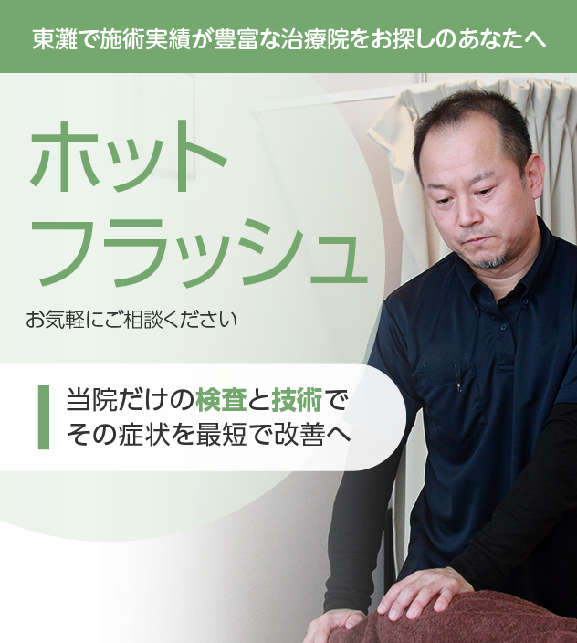 病院やほかの治療院で改善しなかったとしても諦める必要はありません。ホットフラッシュでお悩みなら豊富な施術実績を誇る当院にお任せください。