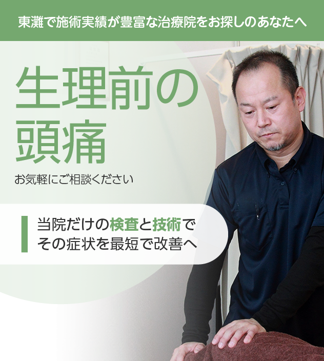 病院やほかの治療院で改善しなかったとしても諦める必要はありません。生理前の頭痛は豊富な施術実績を誇る当院にお任せください。