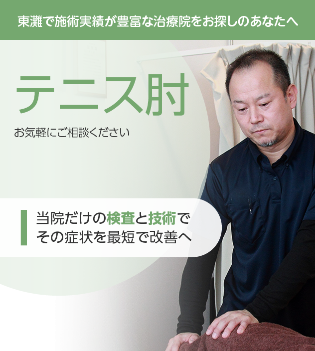 病院やほかの治療院で改善しなかったとしても諦める必要はありません。テニス肘は豊富な施術実績を誇る当院にお任せください。
